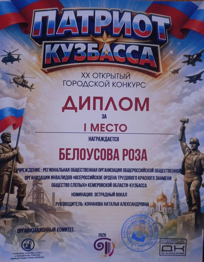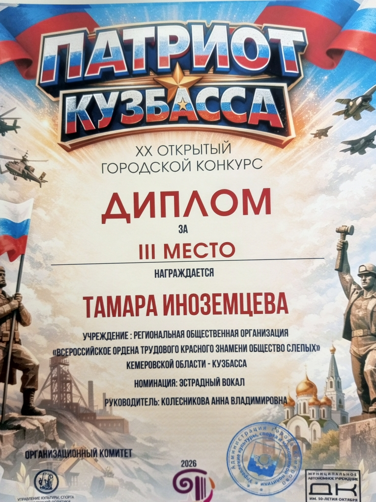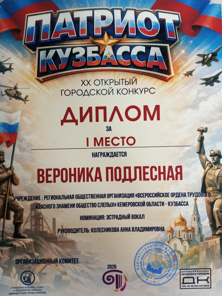 Участники вокальной студии «Гармония» ДК РОО ВОС Кемеровской области – Кузбасса (музыкальный руководитель – Колесникова Анна Владимировна) стали призёрами в номинации эстрадный вокал: Тамара Иноземцева с песней «Россия-матушка» заняла III место, Василий Игуминов с песней «Живы будем-не помрём» стал обладателем II места, Вероника Подлесная с песней «Небесная рать» была награждена Дипломом за I место.