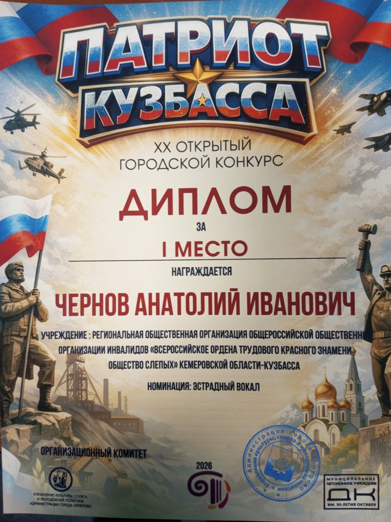 Солист и руководитель студии «Родники» ДК РОО ВОС – Чернов Анатолий Иванович занял I место в номинации эстрадный вокал.