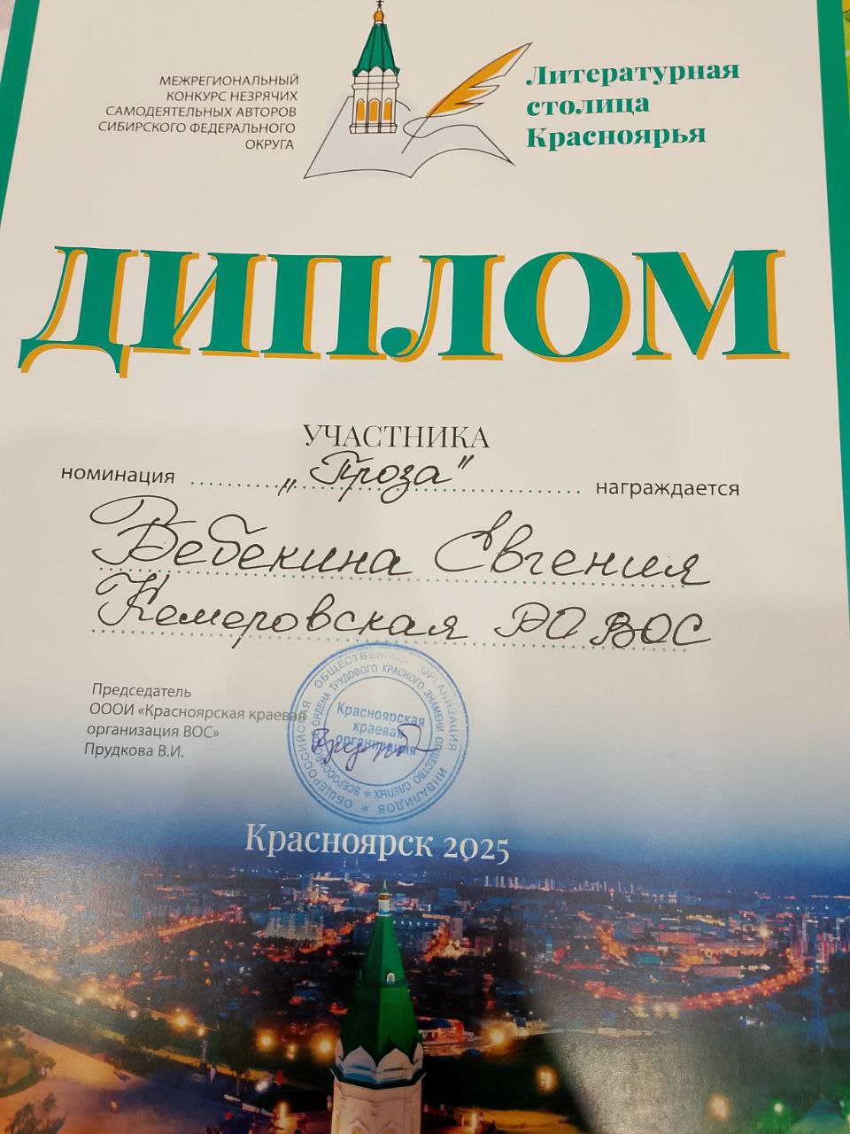 Яркий пример –история двух сотрудниц Кузбасса, которым удалось гармонично соединить работу и творческую самореализацию. Рязанова Юлия, председатель совета молодёжи РОО ВОС Кемеровской области-Кузбасса, и Бебекина Евгения, журналист Федерации спорта слепых, осенью приняли участие в дистанционном межрегиональном конкурсе незрячих самодеятельных авторов Сибирского федерального округа «Литературная столица Красноярья» в номинации «Проза».