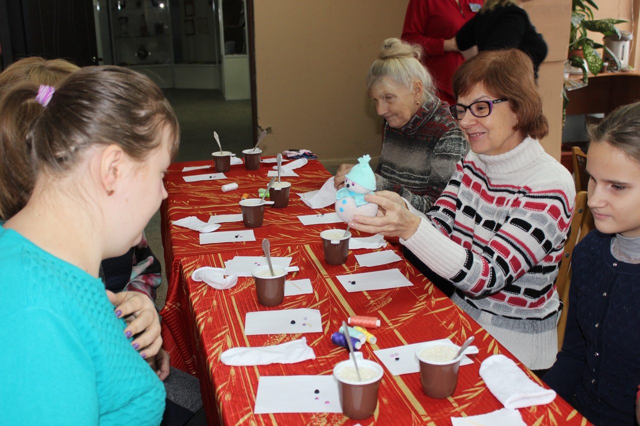 12 членов организации с усердием и старанием изготавливали снеговика из носка на протяжении 2 часов. Несмотря на трудности в изготовлении (люди слабовидящие и незрячие), поделки получились милые и симпатичные. Пока часть волонтёров помогала членам общества творить, вторая часть готовила украшения для помещения Новокузнецкой м/о ВОС. Они изготавливали объёмные снежинки, собирали ёлку, готовили смесь для рисования на окнах.