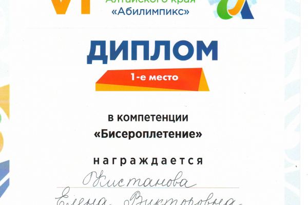 Со слов Кистановой Елены Викторовны: утром прошла регистрация участников, потом торжественное открытие регионального чемпионата профессионального мастерства. На базе ЦРС им. Наумова г. Бийск, проходили соревнования в трёх компетенциях: бисероплетение, сапожное и компьютерное дело. После торжественного открытия все участники отправились выполнять конкурсные задания. Мы плели брошь, компьютерщики обрабатывали текст, сапожники меняли стельки и каблуки. Времени было у нас и у сапожников - 4 часа, у компьютерщиков – 3 часа. Во время выполнения конкурсного задания приходили телевидение, пресса, депутат. Потом у участников было свободное время, а эксперты занимались подведением итогов. Вечером прошло награждение и закрытие чемпионата, где выяснилось, что я заняла первое место в своей компетенции и прошла отбор на национальный чемпионат, который состоится на следующей неделе с 11 по 17.10.2021 года в г. Бийск.