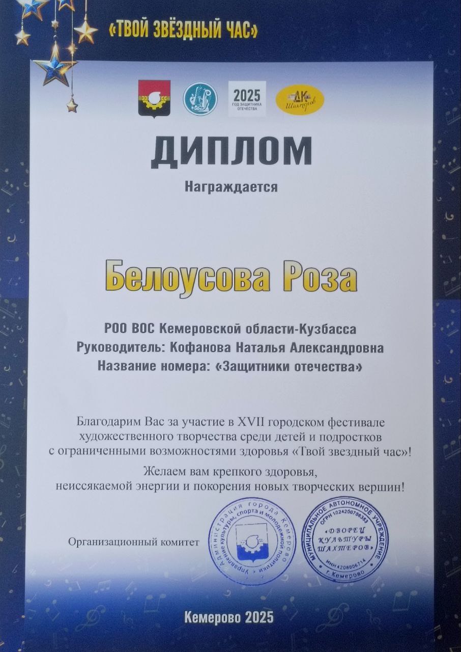 3 декабря 2025 г. В ДК «Шахтёров» г. Кемерово состоялся гала – концерт XVII ежегодного фестиваля художественного творчества среди детей и подростков с ограниченными возможностями здоровья «Твой звёздный час» посвященному Году защитника Отечества.