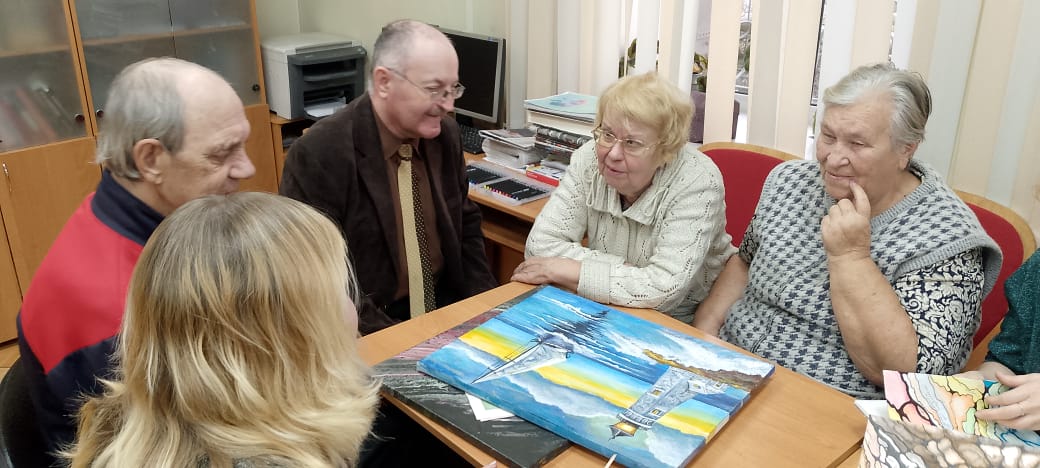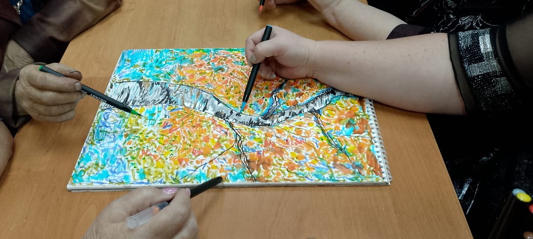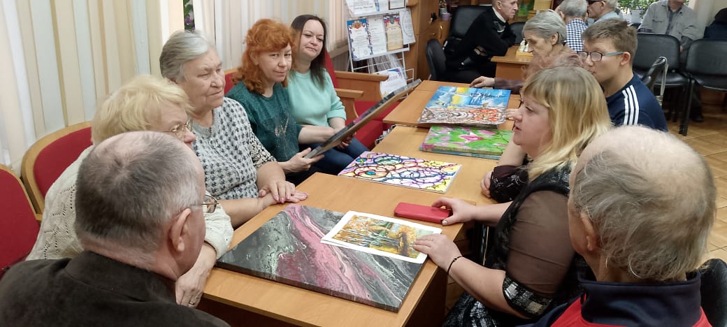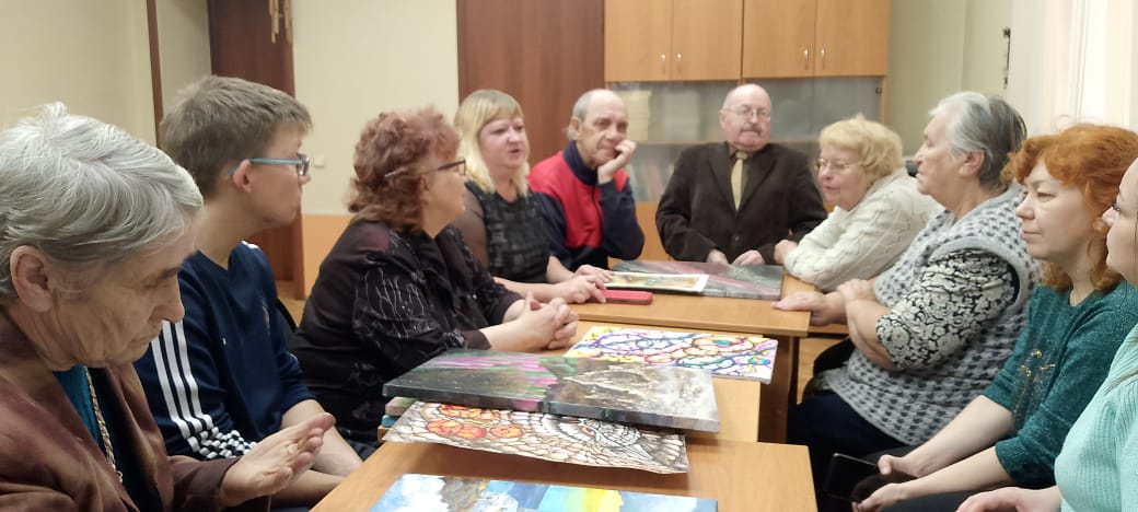 Олеся закончила художественную школу, всегда мечтала стать художником, даже немного работала на фабрике «Весна» г.Кемерово, расписывала подносы, но начались проблемы со зрением и пришлось найти работу по другой профессии. Про адаптивные виды рисования узнала несколько лет назад. Когда уже получила инвалидность. Она не отказалась от своей мечты, освоила эти виды рисунка и сейчас с удовольствие готова поделится своими знаниями со всеми желающими. Олеся рассказала собравшимся о том, что существуют адаптивные виды искусства, необязательно рисовать классическим способом, есть иные современные техники живописи, которые адаптированы под слабовидящих людей, где не обязательно наличие огромного таланта. Было бы желание. Главную роль играет цветотерапия. После чего часть присутствующих все вместе выполнили рисунок «Береза» акриловой живописью, а остальные – подготовили бусины из акриловой глины для создания «Ловца снов» на следующих занятиях. Те, кто все-таки не захотел рисовать, смогли присоединиться к тренеру по шахматам Сергею Ильичу Ерохину и тоже остались довольны временем, проведенным в кругу единомышленников.