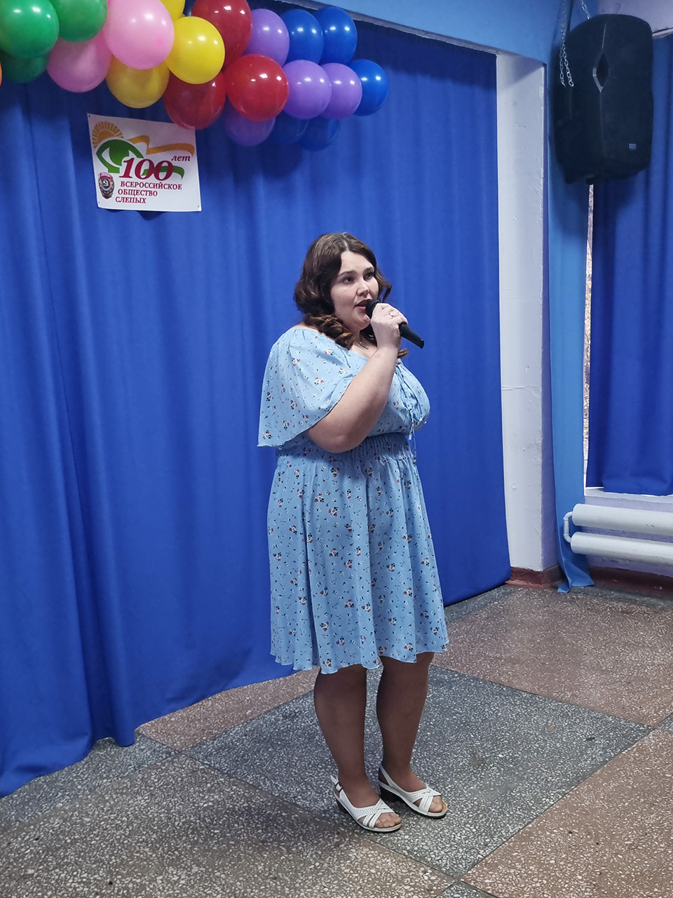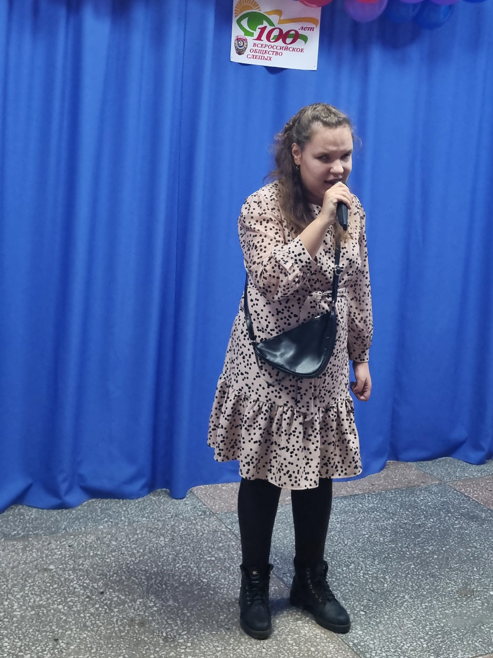 Концертную программу открыла Абрамова Арина - вокалистка из Киселевской местной организации ВОС. Ее выступление сразу оживило публику и задало праздничную атмосферу всему мероприятию.
